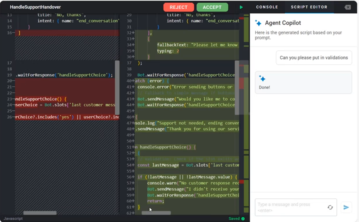 Edit existing scripts by asking Agent Copilot to add validations, conditions, or logic.