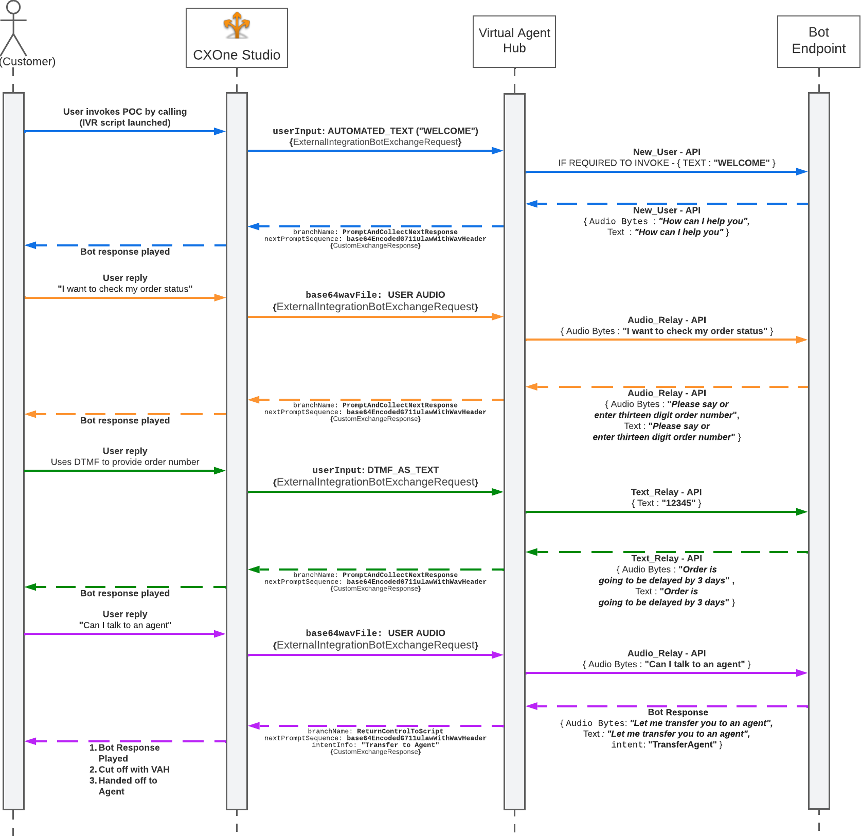 Sequence diagrams are an important part of planning your custom virtual agent integration. You can use them to map out the flow of requests and responses between NiCE CXone, Virtual Agent Hub, the proxy tunnel, and your virtual agent. They may also be helpful in determining the flow your Studio script must follow.
