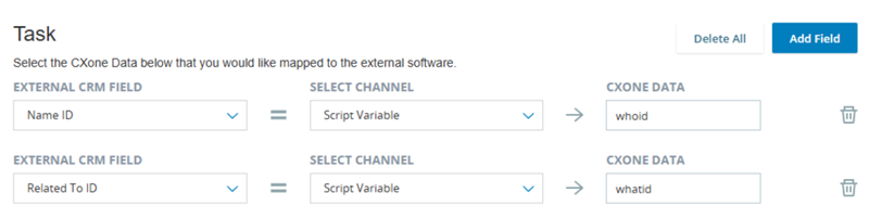 2. In the External CRM Field drop-down, select a Salesforce field that can be mapped to the whoid or whatid NiCE CXone data field. Then select Script Variable in the Select Channel drop-down and enter whoid or whatid in CXone Data.