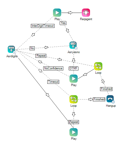 If the entry cannot possibly be correct (for example, the caller gives a non-numeric response), the system takes the OnNoConfidence branch, and returns the caller to the Asrdigits action to re-enter the number. After three unsuccessful attempts, a Loop action asks the contact to call back and hangs up the call.