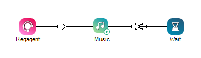 In this partial script example, music is played while the contact waits for an agent to take the call. After music plays for the period established in the SecondstoPlay property, the Wait action introduces a pause before the music resumes. The Music action has been renamed, using the Caption property, to indicate the WAV file specified in the MusicFile property (CruisingJazz.wav).