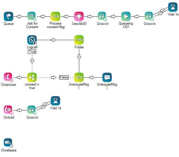 The following excerpt initiates a call recording after attaining consent. The menu allows the contact to confirm or deny consent to be recorded and the decision is logged as True (for confirm) or False (for deny) in the ensuing snippet before requesting an agent. When an agent answers the call, the If action directs the contact to the Logcall action if the consent was confirmed (as True), and Logcall initiates a recording.