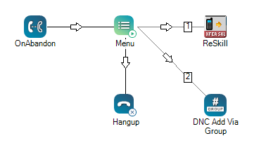 In this example, an Onabandon event triggers a Menu action which presents three options to the contact. One of those actions is Reskill, which assigns the contact to a new skill queue for handling by an agent.