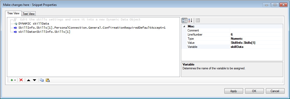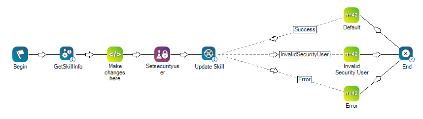 In this sample script, you get skill Used to automate delivery of interactions based on agent skills, abilities, and knowledge. information for a specific skill, and then you use the snippet to change data for that skill and save it into a new dynamic object. You can then set your security user and pass the new dynamic object with the updated skills data into Update Skill. Depending on the path, you'll be able to tell whether or not the skill successfully updated or not.