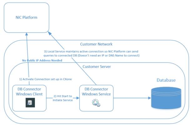 DB Connector is a Windows-based, encrypted service that acts as a gateway between the CXone Mpower platform and your corporate database, working over TLS 1.2. It's commonly used to retrieve information from a private database and provide it to the agent. For example, you could pull a customer number or order number based on the caller ID and use it in a screen pop for the agent to reference. You can also be use DB Connector to write information obtained during an interaction to the private database, although this is less common.