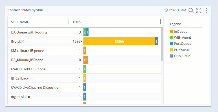 ACD-Widgets bieten Ihnen einen Überblick über die Contact Center-Leistung. Jedes ACD-Widget liefert spezifische Daten über eine bestimmte Funktionalität in Ihrem Contact Center. Sie können die Widgets Ihrem Dashboard hinzufügen, indem Sie sie an die gewünschte Stelle ziehen oder darauf doppelklicken. Außerdem können Sie die Einstellungen verwenden, um Filter zur Anzeige der Daten hinzuzufügen. Sie bieten eine schnelle Anzeige von Contact Center-Echtzeitdaten, während diese erfasst werden.