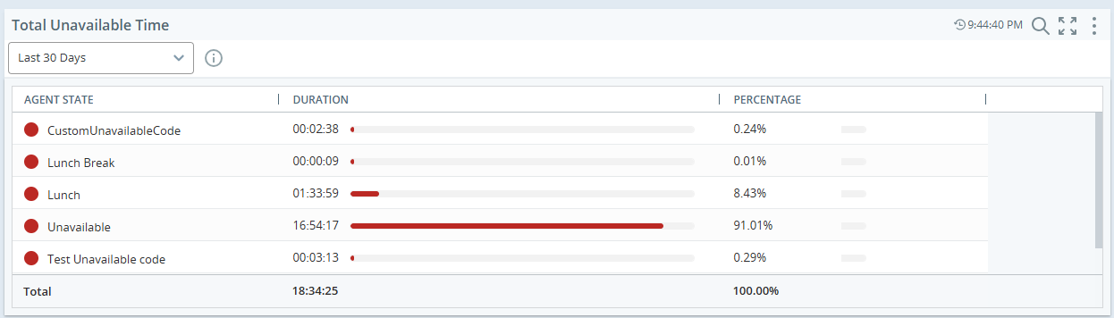 Dieses Widget bietet eine umfassende Aufschlüsselung der Zeit, die ein Agent während seiner Sitzung in verschiedenen „Nicht verfügbar“-Zuständen verbringt. Jeder Nichtverfügbarkeitsstatus, beispielsweise Pause, Besprechung, Schulung oder Systemprobleme, wird einzeln angezeigt, sodass Vorgesetzte die genauen Gründe für die Nichtverfügbarkeit eines Agenten verstehen können. Durch die Segmentierung dieser Zustände bietet es eine bessere Transparenz der unproduktiven Zeit und hilft so, Muster zu erkennen, die Planung zu optimieren und die Gesamteffizienz der Belegschaft zu verbessern.