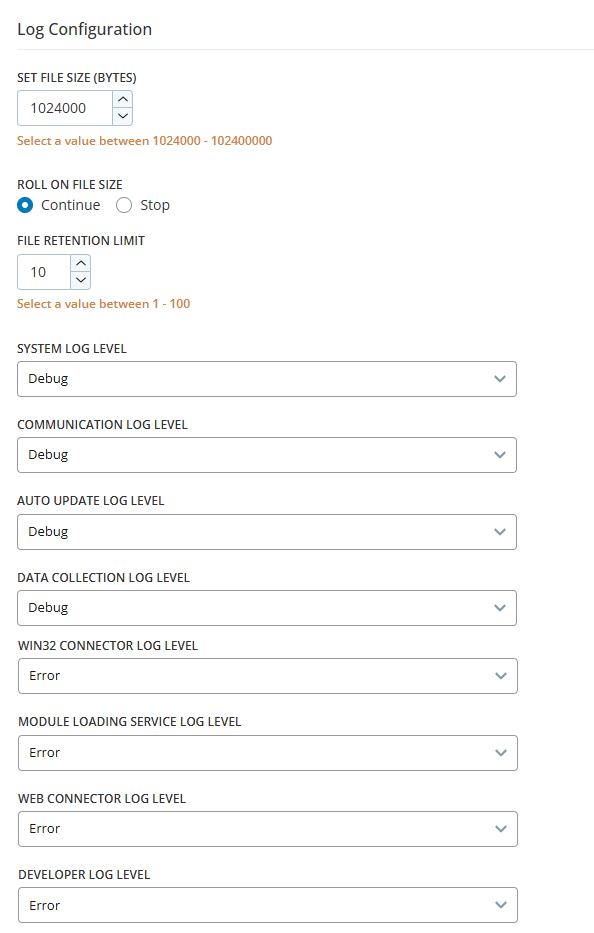 Roll On File Size: Diese Einstellung legt fest, ob der Client eine neue Protokolldatei erstellen soll, wenn die Dateigrößenbeschränkung (Festgelegte Dateigröße (Bytes)) erreicht ist. Es gibt zwei Möglichkeiten: