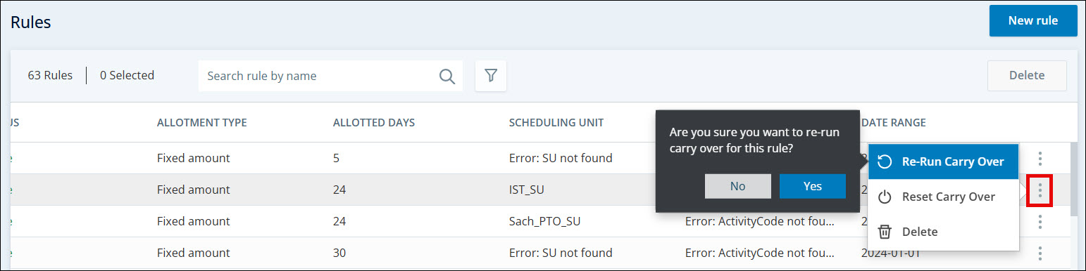 Verwenden Sie die Option Rerun Carryover, um den Übertragsprozess nach Vornahme der erforderlichen Anpassungen erneut auszuführen. Dadurch werden zuvor übertragene Werte überschrieben, um sicherzustellen, dass die Urlaubsansprüche korrekt sind und Ihren Richtlinien entsprechen.