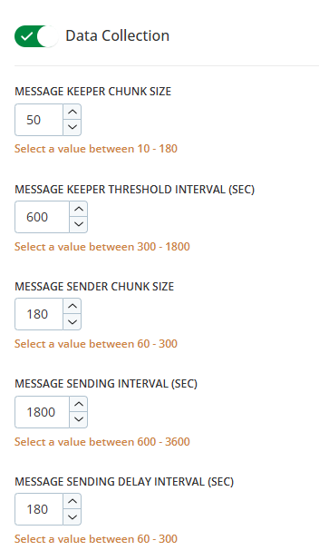 Tamaño del fragmento de Message Keeper: establece la cantidad de mensajes almacenados en cada fragmento antes del procesamiento. Puede seleccionar un valor entre 10 y 180 acciones. El valor predeterminado es 50.