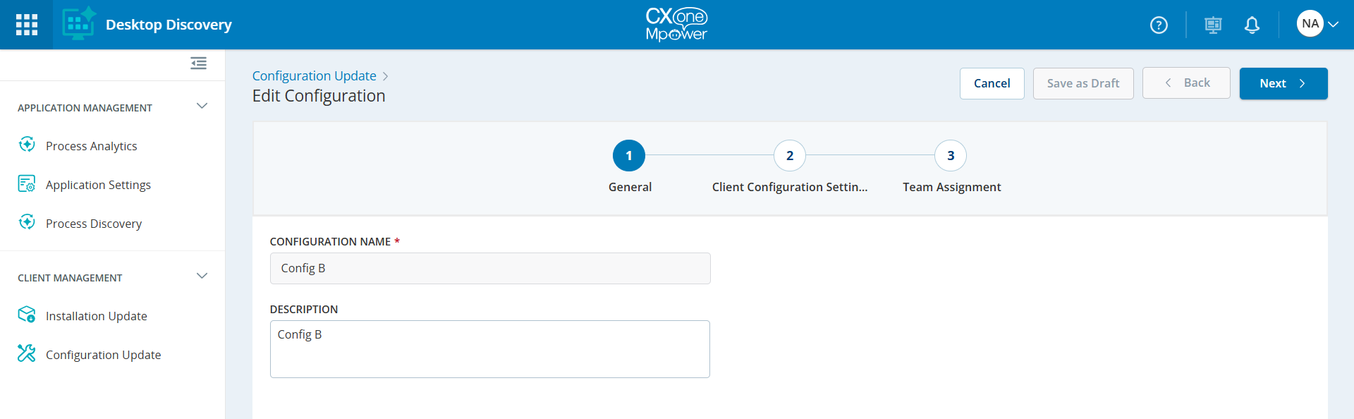 Vaya a Workforce Engagement > Desktop Discovery > Client Management > Configuration Update.
