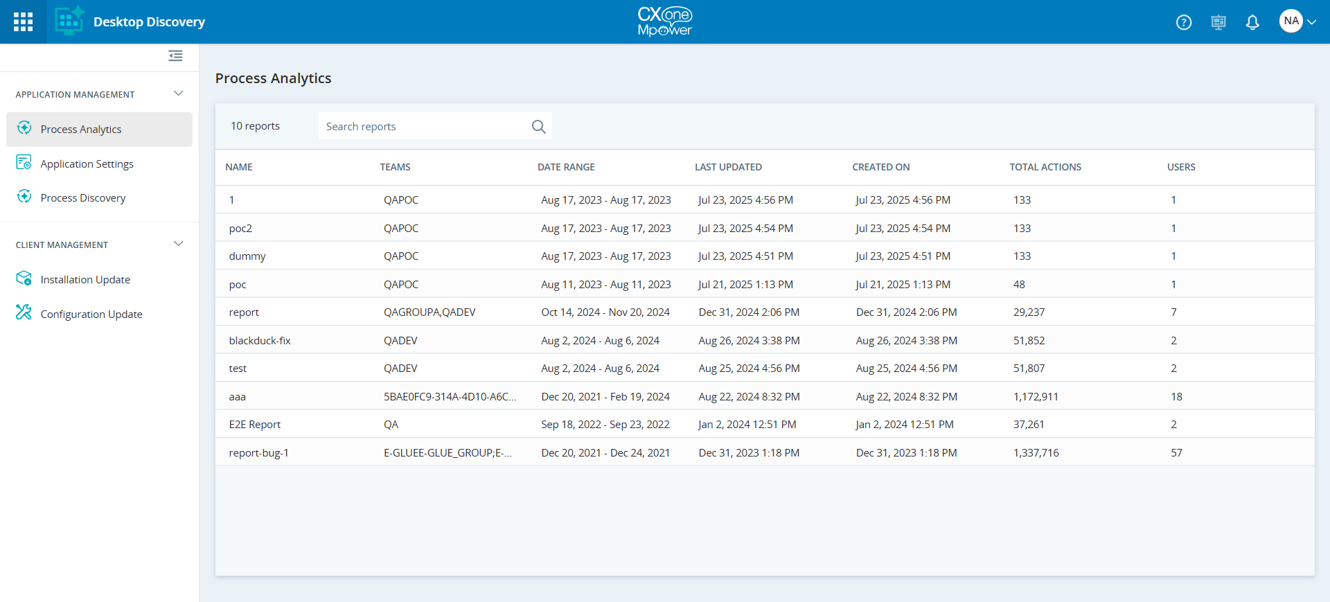 La página Process Analytics muestra todos los informes actuales. Cada informe es un grupo de rutinas descubiertas dentro del marco de tiempo especificado y realizadas por los equipos seleccionados. Puede buscar un informe en el campo Informes de búsqueda. Seleccione un informe para abrir la vista Informe de análisis de procesos. Para obtener más información, consulte Página de informe de análisis de procesos.