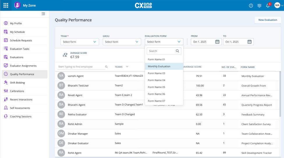 Para acceder a los puntajes de calidad por equipo y agente junto con un análisis detallado de la evaluación, acceda a la página Desempeño de calidad en My Zone.
