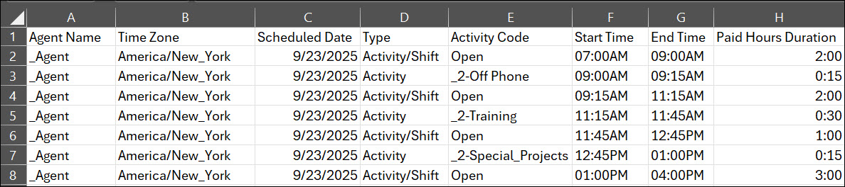 Los archivos CSV exportados son más fáciles de leer y comprender, con un desglose claro, línea por línea, de las actividades diarias. Cada entrada está etiquetada como actividad, turno u otro tipo, lo que proporciona una vista más organizada del cronograma. Los datos están ordenados por línea de tiempo, lo que facilita su seguimiento y uso. Estas mejoras hacen que los archivos exportados sean más útiles para la elaboración de informes, el análisis y la planificación de la fuerza laboral.