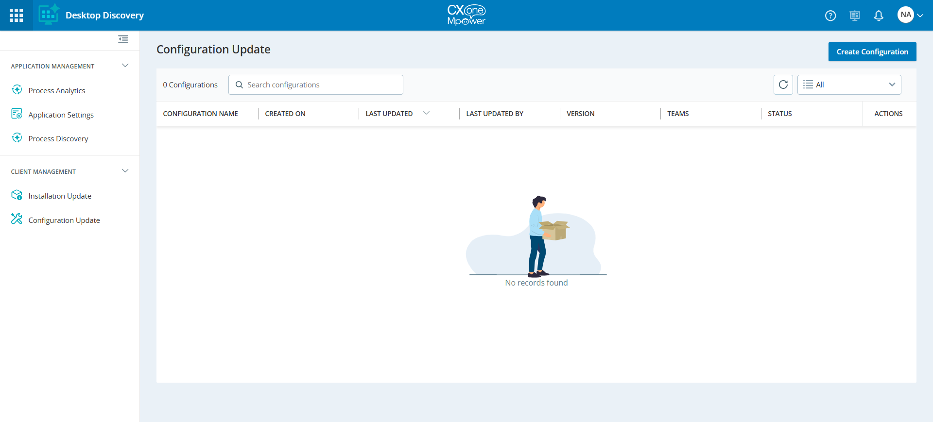 Pour accéder à la fonctionnalité de mise à jour de la configuration, l'application Desktop Discovery doit être activée sur le locataire CXone. Reportez-vous à Gérer les locataires pour activer les applications CXone Mpower.