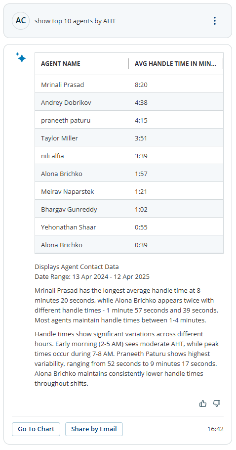 John demande d’autres métriques en langage naturel, telles que « Montrez-moi les 10 raisons de contact qui ont eu le plus grand volume la semaine dernière » et « Montrez-moi les 10 équipes dont le sentiment moyen du client a été le plus faible la semaine dernière ».