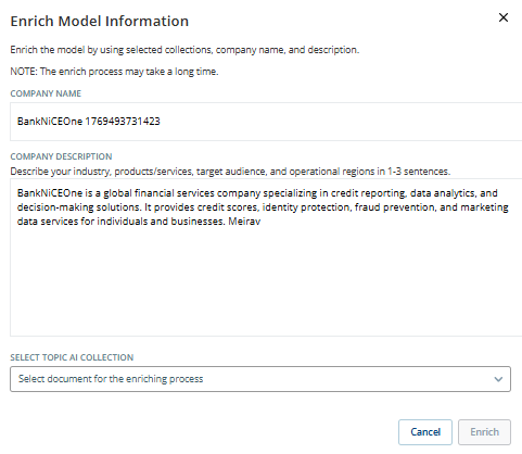 Remplissez les champs requis. Modifiez la description de l'entreprise si nécessaire, sélectionnez la collection appropriée dans la liste déroulante Sélectionnez Topic AI Collection et cliquez sur Enrichir. Le processus d'enrichissement utilise les données d'interaction client de la collection sélectionnée pour créer un modèle enrichi qui conserve le modèle original tout en ajoutant de nouvelles intentions et actions.
