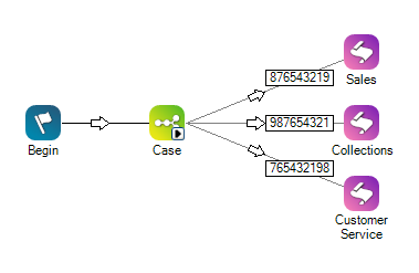Par exemple, l'action Case peut être utilisée dans un script de chat où la fenêtre de chat présente un formulaire de pré-chat au contact. Dans une liste déroulante du formulaire, le contact choisit parmi une liste de produits à discuter. Les produits sont configurés en tant que variables dans l'action Begin pour le script, et l'action Case est ensuite utilisée pour mettre en place des différentes branches en fonction du produit que le contact a sélectionné.