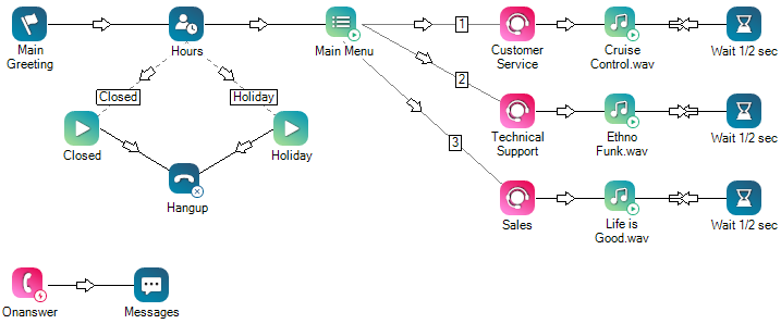 L’exemple de script suivante présente l’événement Onanswer. Le script met en place un IVR entrant de base avec des options de menu pour Customer Service, Technical Support, and Sales, which correspond to 1, 2 et 3. Il s'agit des chiffres sur lesquels le contact appuie sur le clavier pour choisir une option de menu. L’événement Onanswer se trouve en bas à gauche du script. Il n’est pas connecté à la partie principale du script. Il en est séparé, avec une indication qu’il s’agit d’une action d’événement. Dès qu’un agent répond à l’interaction, le script passe à Onanswer et envoie un message à l’agent. Le message est configuré dans l’action Messages.