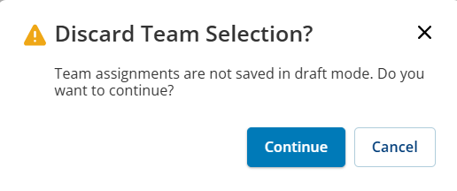 Cliquez sur Continuer pour annuler la sélection de l'équipe et enregistrer la configuration du brouillon.