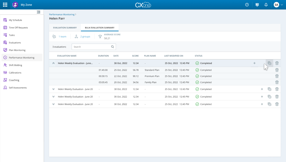 Affiche le score moyen global de toutes les évaluations correspondant aux filtres sélectionnés. Recherche Permet la recherche par nom d'évaluation. Nombre d'Évaluation Affiche le nombre total d'évaluations (par exemple, 3 évaluations). Nom de l’évaluation Affiche le nom de l'évaluation (par exemple, Évaluation hebdomadaire d'Helen - Juin). Durée Affiche le temps total nécessaire pour effectuer l'évaluation. Date