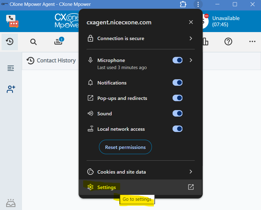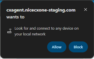 Pour résoudre ce problème, vous devez autoriser l'accès au réseau local. Ceci s'applique aux utilisateurs de Google Chrome et de Microsoft Edge et affecte tous les clients CXone, y compris MAX, Agent, Salesforce Agent et d'autres. Les étapes ci-dessous présentent des exemples pour CXone Agent et MAX, mais le processus est le même pour tous.