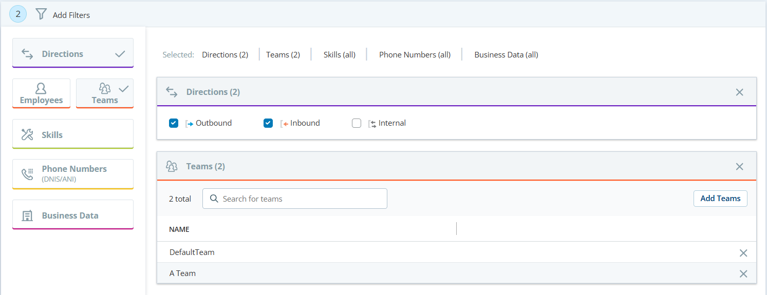 Wanneer u de filters Richtingen, Skills, en Telefoonnummers toevoegt, worden interacties opgenomen die aan de criteria in alle filters voldoen. Wanneer u bijvoorbeeld de filters richting en skill toevoegt, worden de interacties opgenomen wanneer deze voldoen aan de criteria opgegeven richting EN skill.