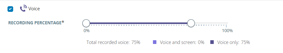 Para interações de voz e discador, você configura a porcentagem de chamadas a serem gravadas. Você também pode configurar a porcentagem de chamadas que devem incluir gravações de tela. Para chamadas de discador (com agente ou sem agente), as interações são registradas a partir do momento em que o cliente atende a chamada. Se uma chamada durar menos de 4 segundos, será considerada uma chamada curta e não será gravada.