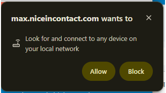 Para corrigir isso, você deve permitir o acesso à rede local. Isso se aplica a usuários Google Chrome e Microsoft Edge e afeta todos os CXone Clientes, incluindo MAX, Agent, Salesforce Agente outros. As etapas abaixo mostram exemplos para CXone Agent e MAX, mas o processo é o mesmo para todos.