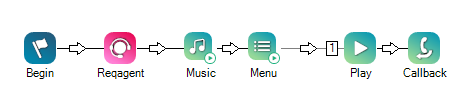 在此脚本中,请求一个坐席,当联系人在队列中等待时,音乐将播放 30 秒。 在 30 秒结束时,一个菜单询问联系人是否希望在有坐席时得到回呼。 如果是,请按 1。 如果否,则继续等待。 如果用户想要回呼(而不是系统直接挂断),则 Play 操作用于表示感谢。