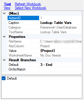 2. 双击 LookupTableVars 打开向导。 如果已经上传了电子表格并想要选择一个新电子表格,请右键单击该操作,然后从属性窗口中单击选择新工作簿