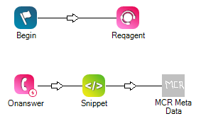 在此示例脚本中,在应答呼叫后,Snippet作会创建一个具有多个自定义字段的动态数据对象,并将该动态对象传递给MCR Meta Data。 然后,当呼叫断开时,MCR Meta Data 将这些自定义字段传递给 CXone Mpower 录音,作为元数据包含在录音中。