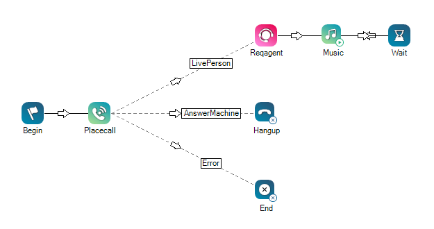 下面演示的脚本使用 Placecall 操作来拨打一个呼出呼叫。 如出现错误,则不拨打呼叫电话,且脚本以 End 操作结束。 但是,拨打呼叫电话后,如果是答录机应答,系统会使用 Hangup 来结束呼叫。 如果是真人应答,会对具有指定 ACD 技能关闭 用于根据坐席的技能、能力和知识自动传递交互。的坐席发出请求。