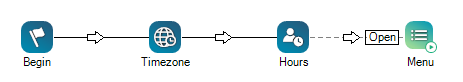 在此基本的部分电话脚本示例中,Begin 触发脚本,然后该脚本使用 TimeZone 属性(在Timezone 操作中)将时区设置为东部标准时间。 随后,脚本将使用营业时间配置文件(在 Hours 操作中创建),来确定联络中心是否为开放状态。 若已开放,Menu 将为呼叫者提供选项。