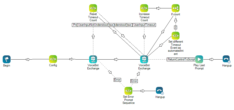 在此脚本中,Snippet 操作用于创建和递增超时计数器。 第二次超时后,Snippet 操作则用于设置不同的超时事件。 交替超时事件通过 automatedIntent 属性从 Snippet 操作传递给语音机器人操作。