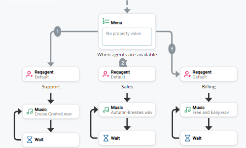 3. 要完成 Wait 的配置,您需要将其连接回 Music,以便其创建一个可以重复(至坐席应答呼叫为止)的循环。 将光标悬停在 Wait 上,然后单击并按住该操作最靠近 Music 那一侧的连接点。 将连接器拖至 Music 并将其放在连接点上,然后选择 默认 条件。