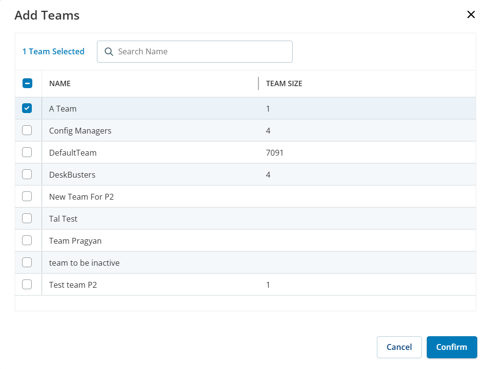 在 添加团队 对话框中,选中要添加的团队名称旁边的复选框。 您可以选择多个团队。