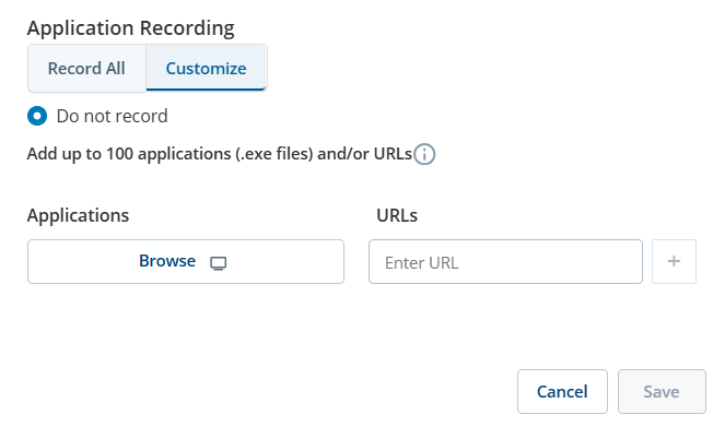 您可以定义应用程序和 URL 的拒绝列表,以保护敏感数据。 如果拒绝列表中的应用程序或 URL 在坐席的屏幕上打开,则屏幕录制将停止。
