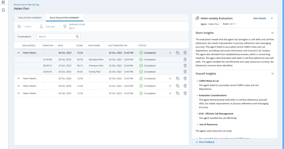 商業價值:評估摘要功能提高了績效審核的效率,實現有針對性的指導,並最終改善客服專員績效和客戶體驗。 它為經理節省了時間並提供了明確的方向。
