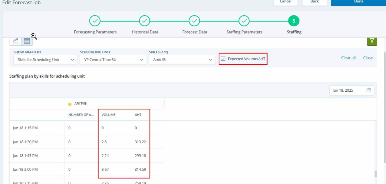 在檢閱預測資料步驟時,您會看到所有選定技能的預測量和 AHT。 資料可能看起來不准確,而您希望看到正常值: